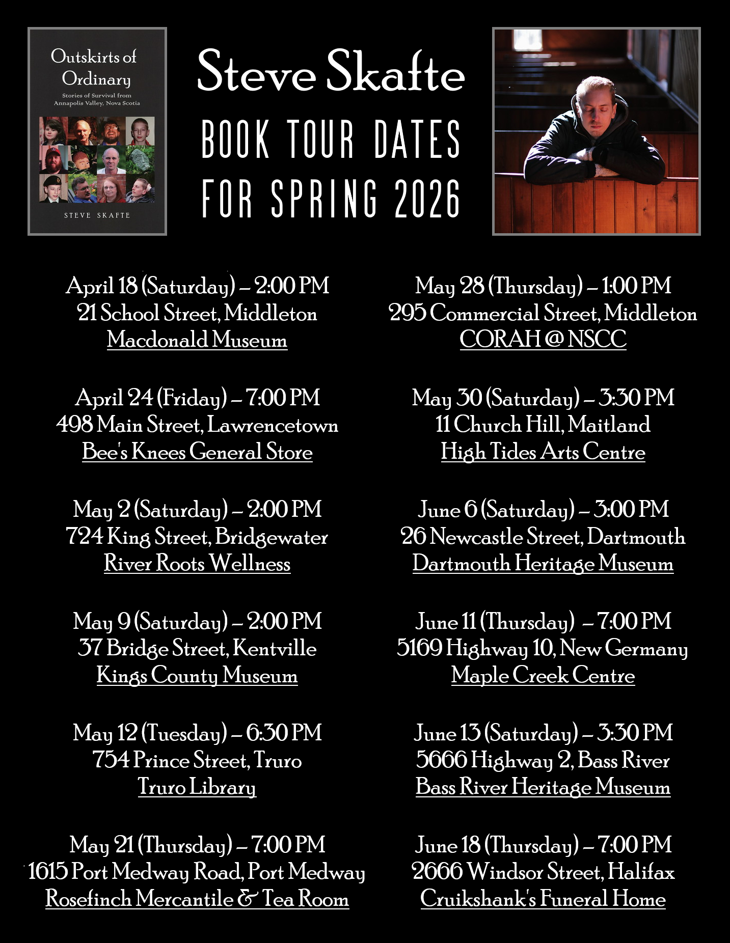 Outskirts of Ordinary (April 18, 2026) is a heartfelt and harrowing collection of stories about folks in the Annapolis Valley. Content is a mixture of photos and prose. The overall theme of the book is people who overcame difficult odds to become themselves, often involving struggles with their mental health. There are ten stories, including Denny Lunn (retired Air Force, Greenwood), Christie D’Aubin (butcher’s daughter, Bridgetown), James Lightle (Afghanistan veteran, Round Hill), Linda White Holloway (artist, Greenwood), and Brent Reeve (granite carver, Berwick). The remaining five stories are from my childhood.